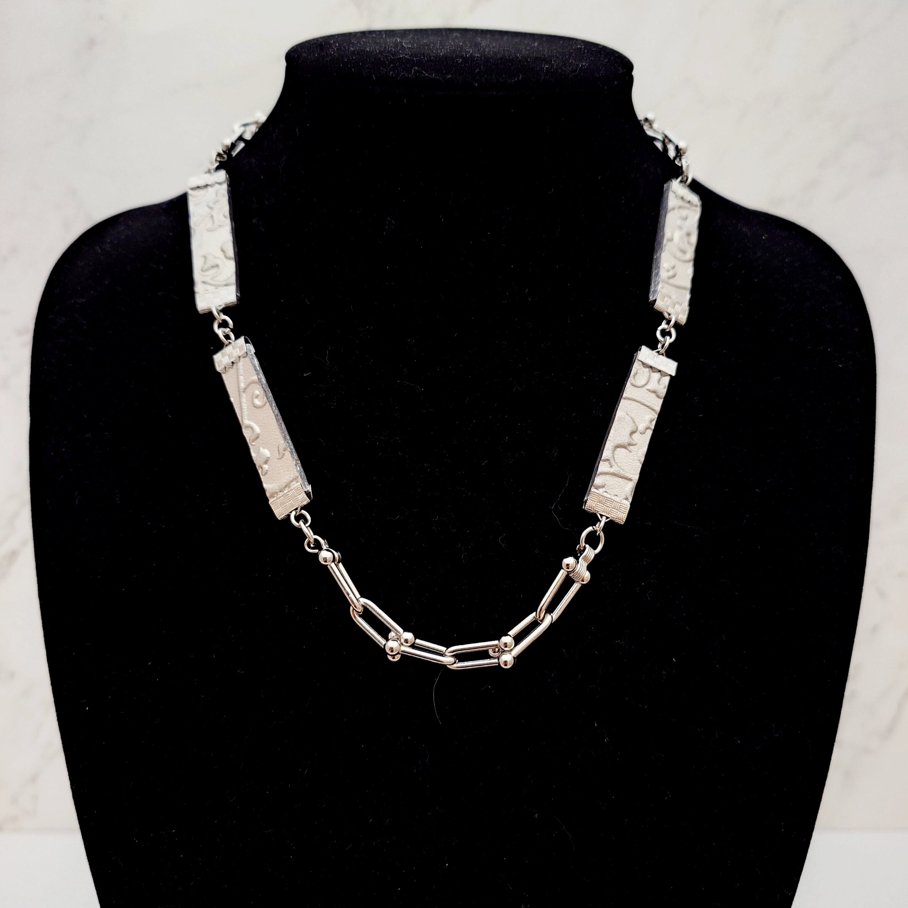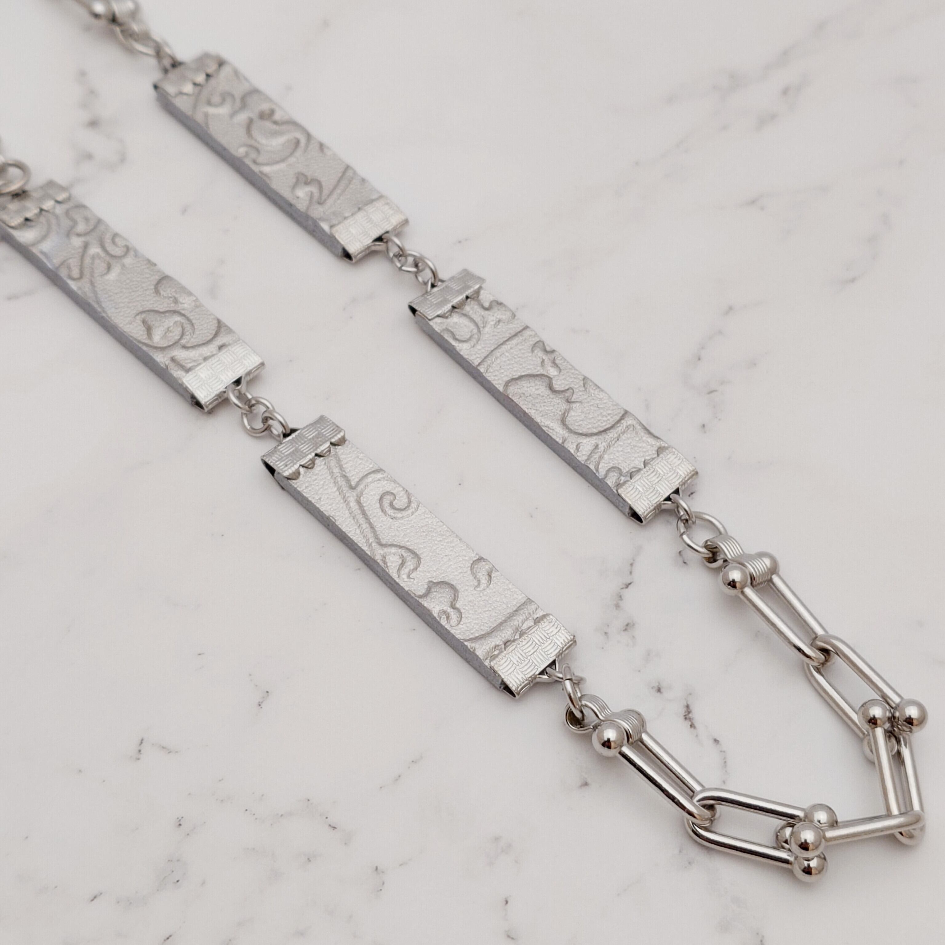 ラグジュアリーな素材であるプラチナ箔を使用した、洗練されたデザインのスクウェア・チェーン・ネックレスです。