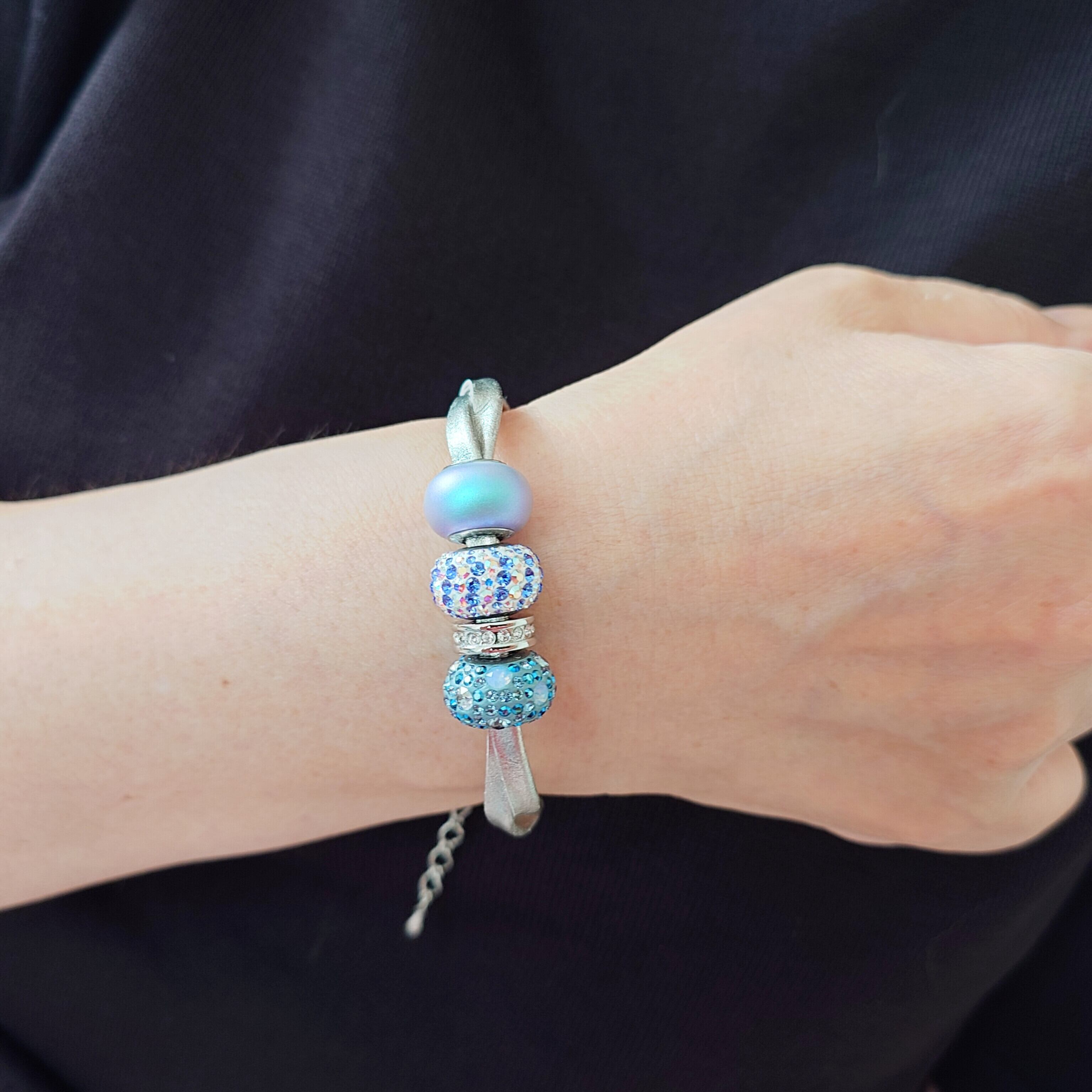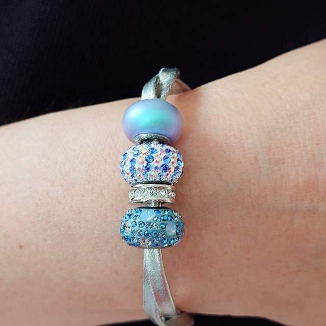スワロフスキーが光を受けて放つ煌めきと、プラチナ箔による上品な輝きが優雅に調和し、主張しすぎない美しさで手首を飾ります。