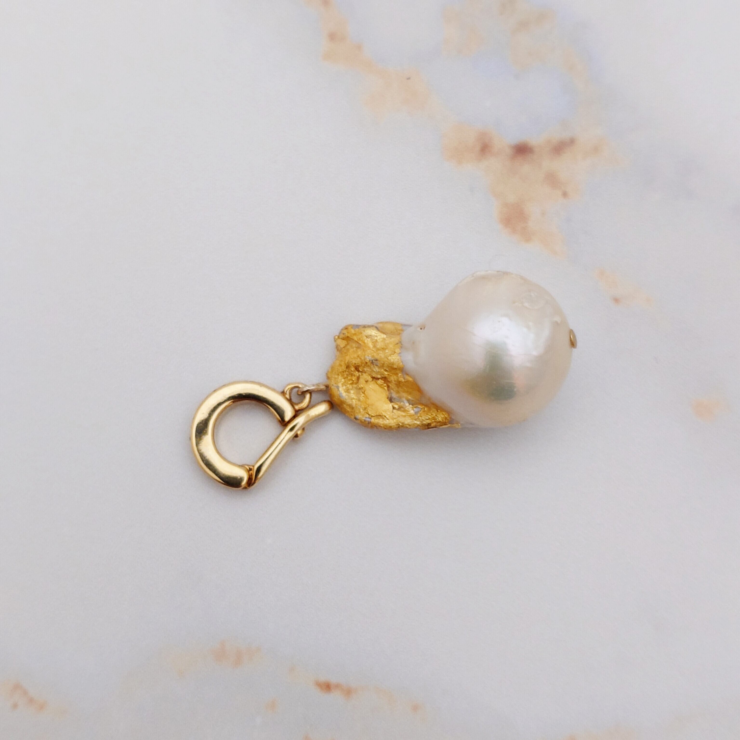 ペンダントトップには金箔をランダムに施した淡水パールのバロックを使用。