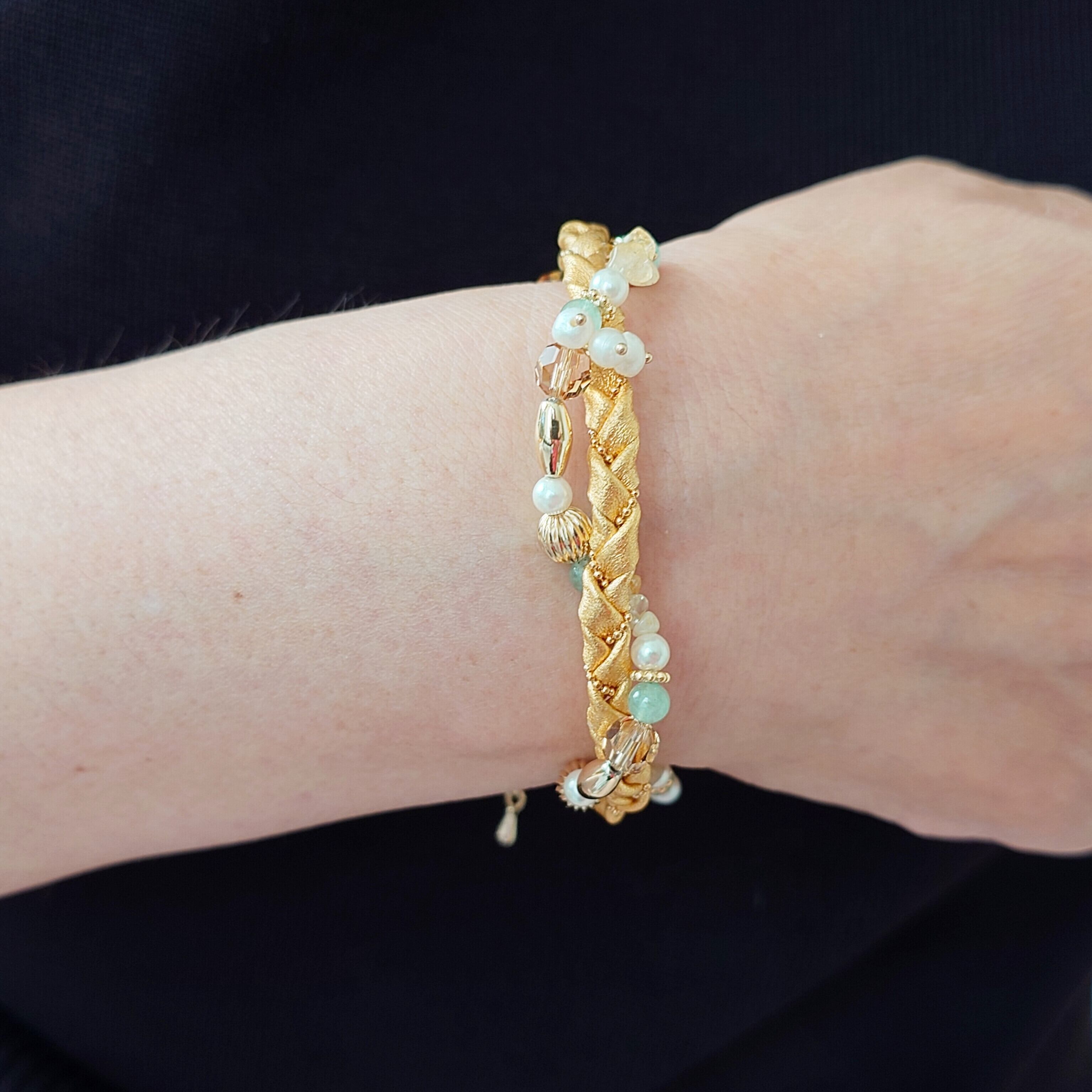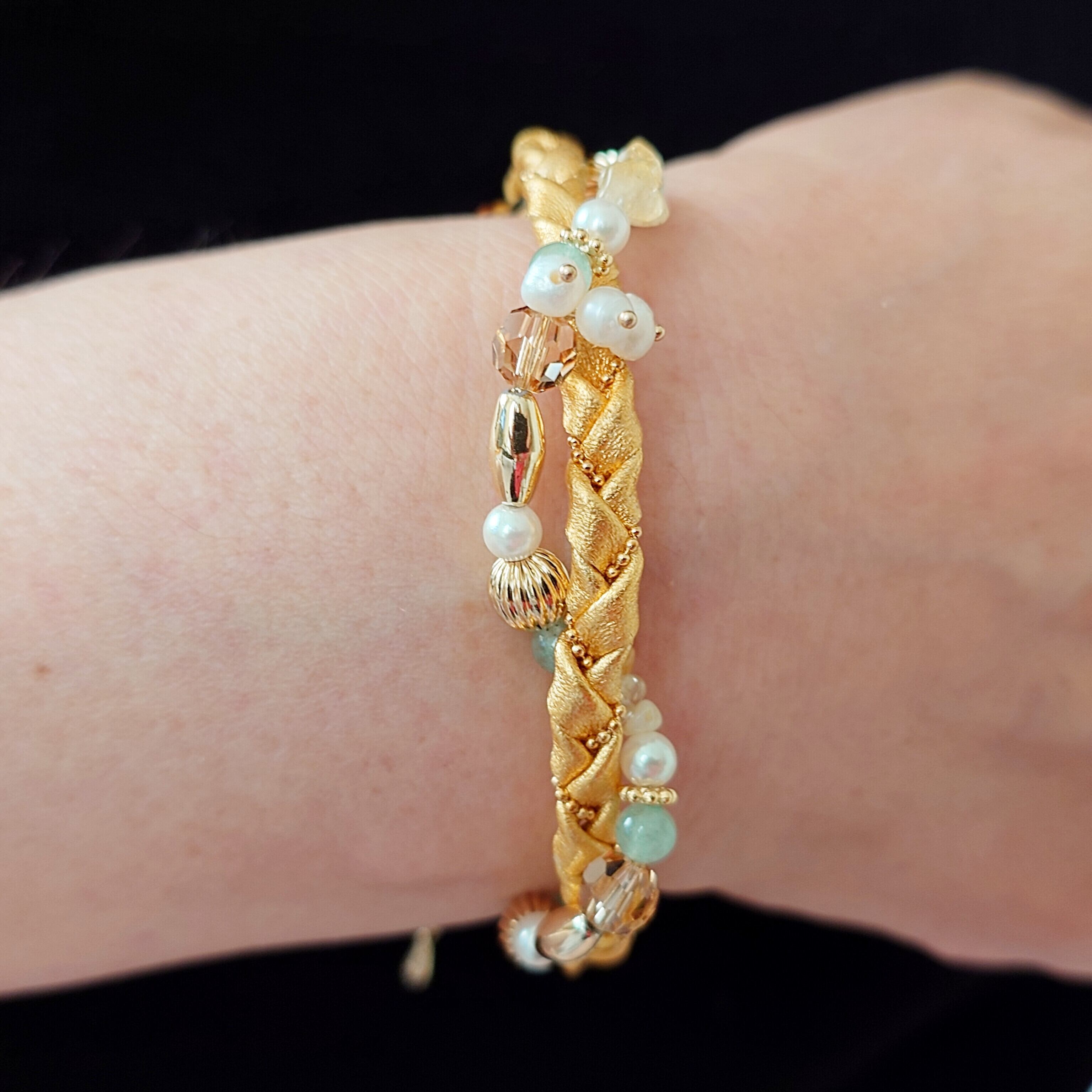 身につけることで、日常の中に特別な輝きを与えてくれるK24純金箔三つ編み&天然石・ダブルブレスレット。